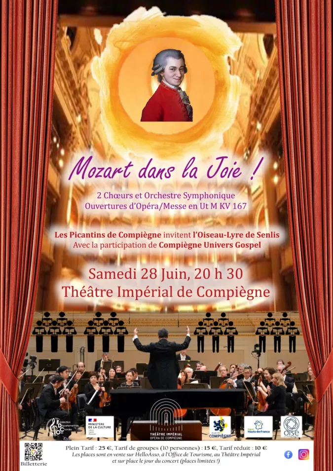 “Mozart dans la Joie !” Théâtre Impérial de Compiègne  –  Samedi 28 juin à 20h30 Une de nos adhérentes, Karin, est membre de l’association la chorale des Picantins. Cette chorale va donner un concert dans un endroit prestigieux, le théâtre impérial de Compiègne. Trois chœurs unissent leurs voix : Les Picantins, L’Oiseau Lyre et Gospel. Et ils…