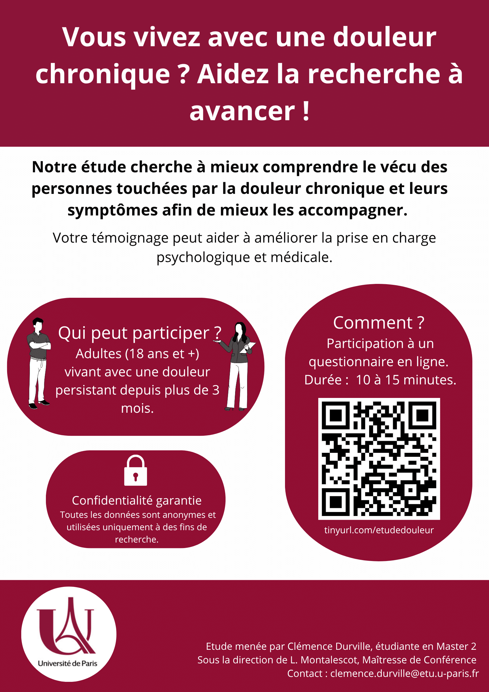 Si vous avez 18 ans et + et que vous souffrez de douleurs depuis plus de 3 mois, vous pouvez participer en répondant au questionnaire (durée 10 à 15 minutes).