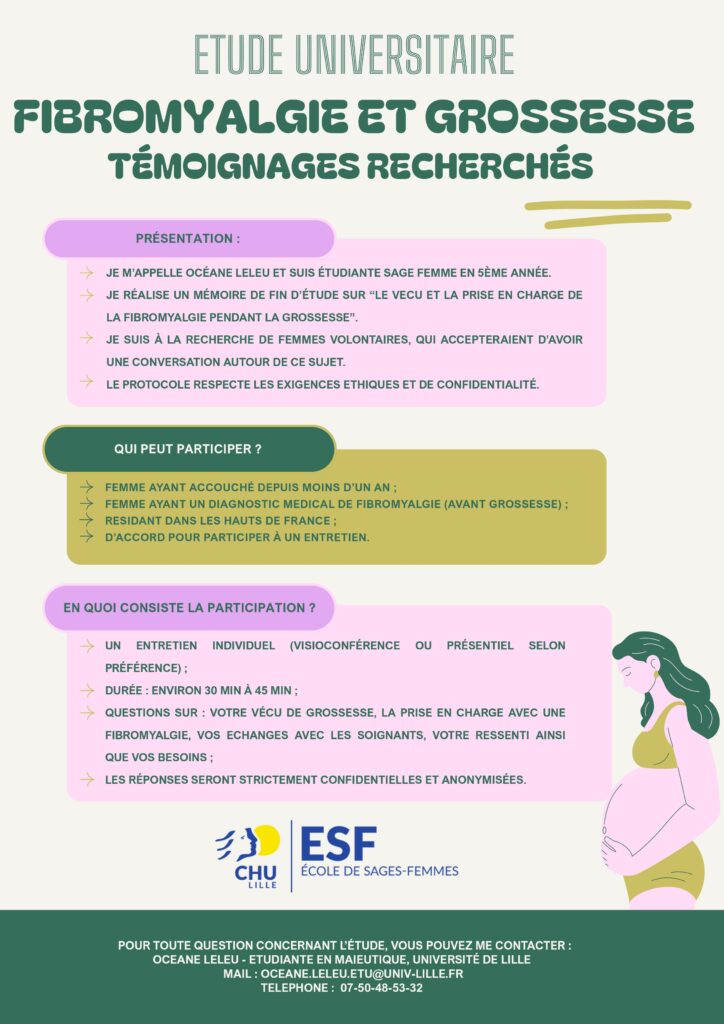 Dans le cadre de son mémoire, portant sur la prise en charge de la fibromyalgie pendant la grossesse et le post-partum, une étudiante sage femme en 5ème année, Océane Leleu, nous sollicite.