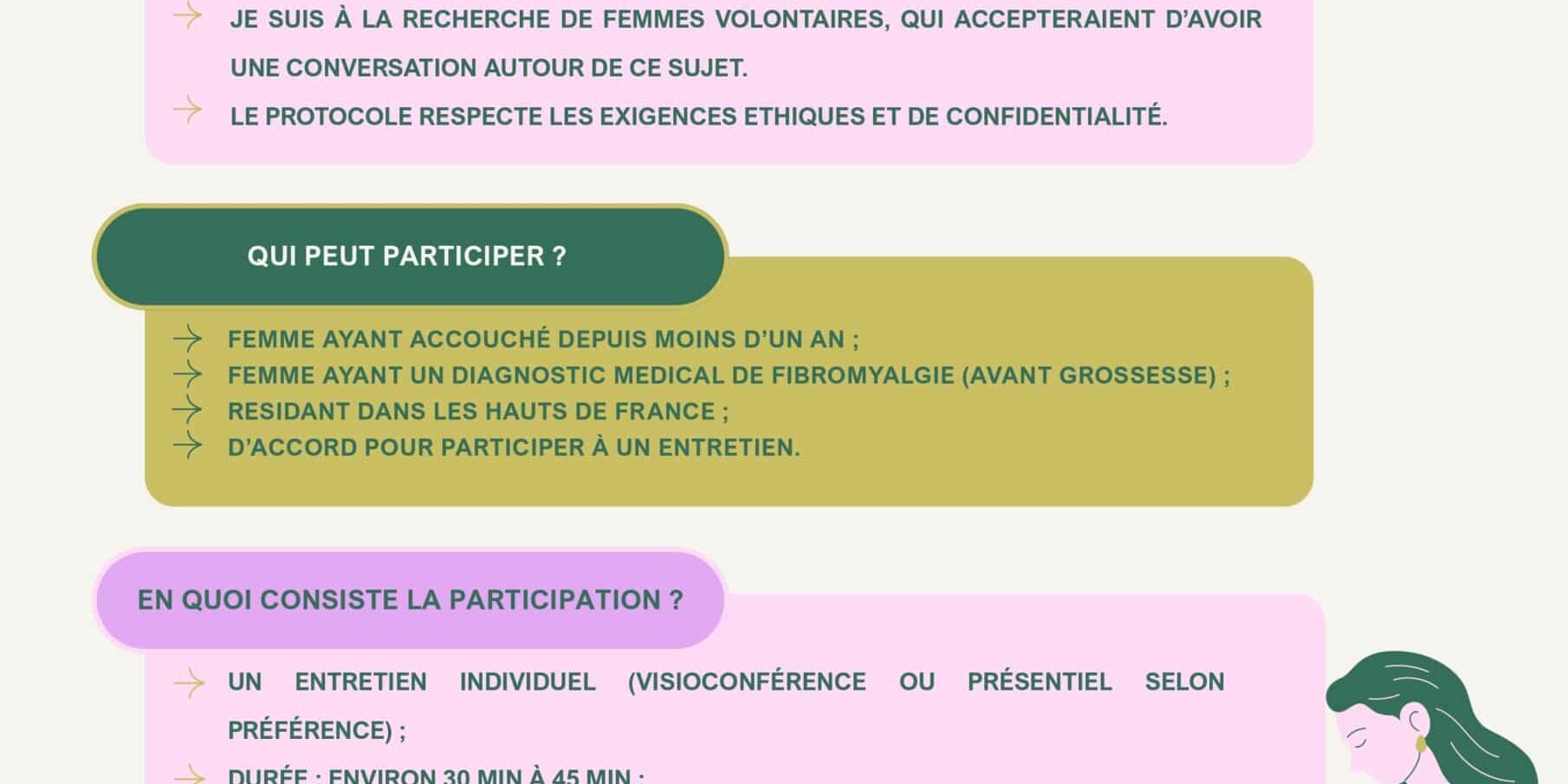 Océane recherche actuellement des femmes ayant accouché depuis moins d’un an, présentant un diagnostic de fibromyalgie, résidant dans les Hauts de France et souhaitant partager leur expérience au cours d’un entretien confidentiel de 30 à 45 minutes (en visioconférence ou, si possible, en présentiel).