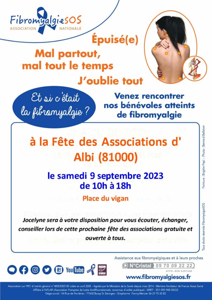 Hôpital Purpan à Toulouse – forum des associations Un forum des associations est organisé à l’ hôpital Purpan de Toulouse Mardi 3 octobre 2023 de 12h00 à 16h Au niveau des consultations   N’hésitez pas à venir, même pour un court moment ; Jocelyne (joce81@fibromyalgiesos.fr) et Virginie seront là pour vous renseigner, pour échanger. N’oubliez pas la permanence mensuelle…