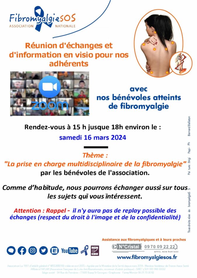 Réunion mensuelle en visio pour les adhérentes et adhérentes – samedi 3 février 2024 à 15h. Le thème du jour sera “Les programmes 2024 des cures thermales fibromyalgie” par Ghyslaine, présidente d’honneur, qui s’occupe du dossier “cures”. Les documents relatifs aux cures ont été adressés aux adhérents par mail (surveillez vos spams) et la page…