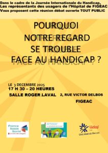 Réunion débat à l’Hôpital de Figeac (Lot) Dans le cadre de la journée internationale du handicap, les représentants des usagers du centre hospitalier de Figeac (pour la deuxième année consécutive), vous proposent : ” Pourquoi notre regard se trouble face au handicap” Mercredi 3 décembre de 17h30 à 20h00 Hôpital de