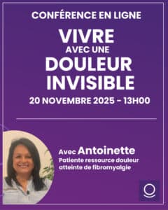 Discuter directement avec une patiente atteinte de douleur invisible (fibromyalgie) qui partagera son expérience et répondra à vos questions.