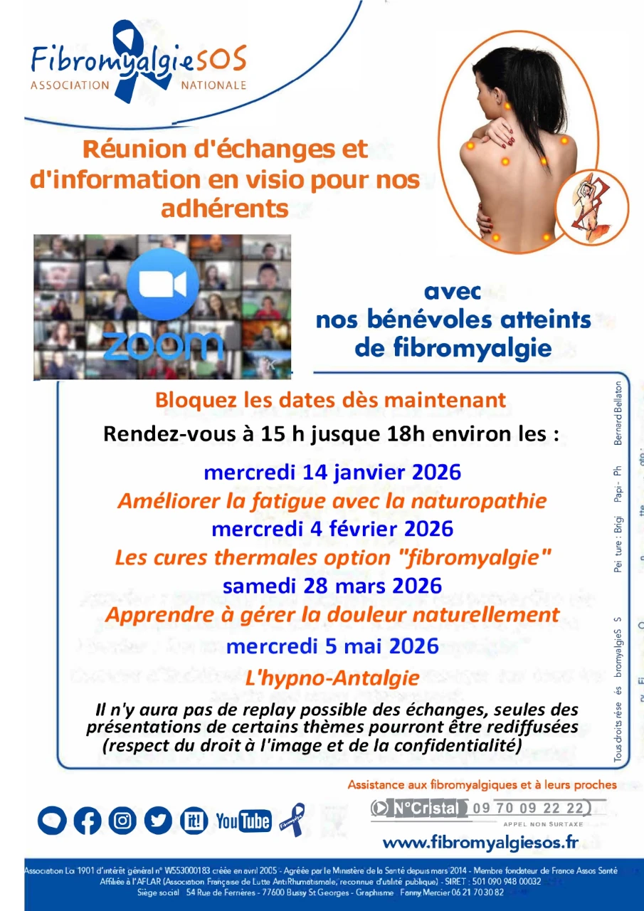 Des réunions ont lieu en visio-conférence sur Zoom tous les mois (sauf vacances scolaires) mais uniquement pour les adhérent(e)s à FibromyalgieSOS.