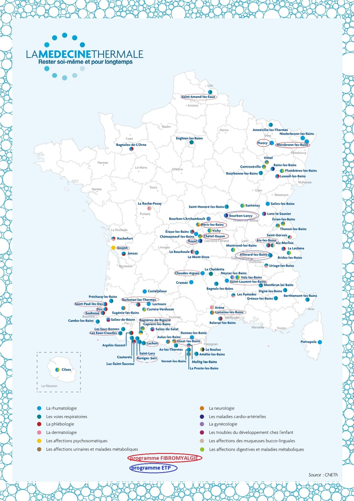 Pour vous aider à les trouver nous avons dressé une carte de France des établissement thermaux qui ont un programme « fibromyalgie » (entourés en rouge) et ceux ayant un programme ETP (en bleu).
